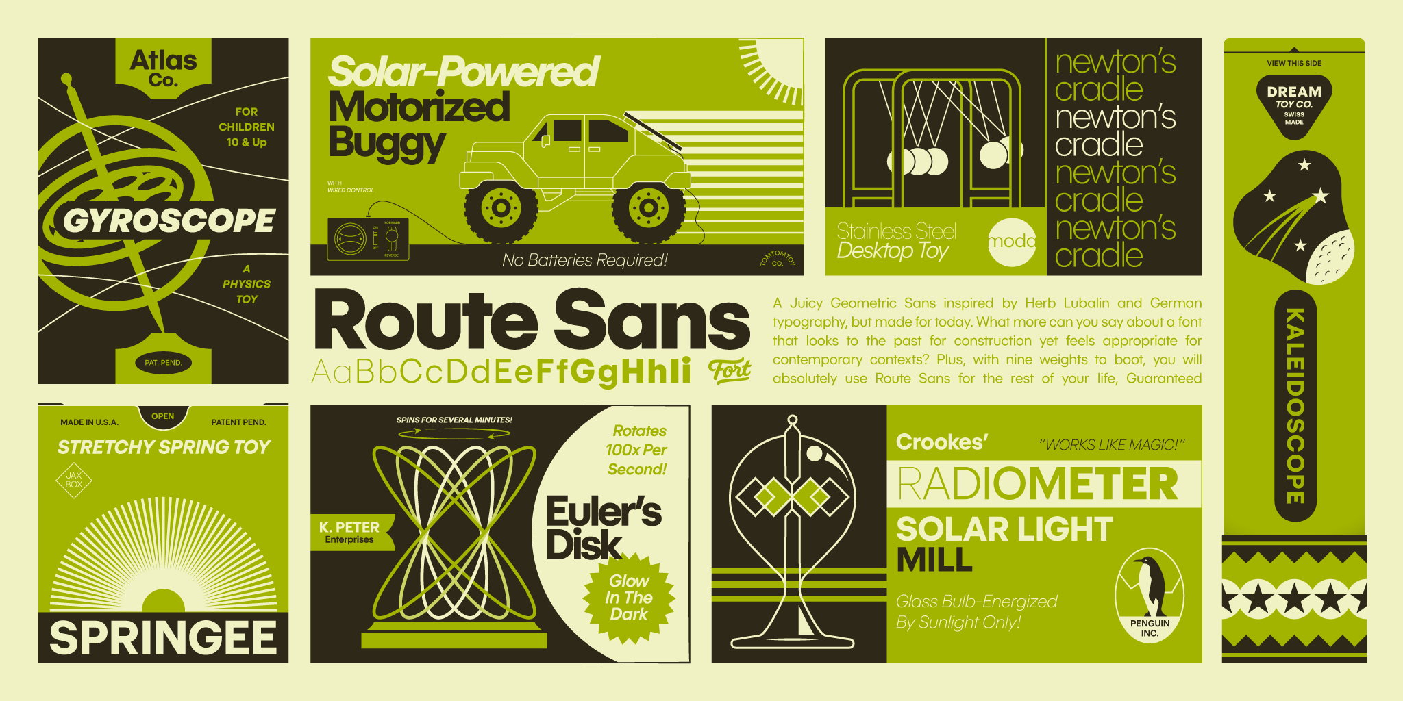 The decidedly more modern twin of Scenic Sans, Route Sans brings to the forefront a more geometric style that was simply too fun to be left buried as a stylistic alternate in another family.
